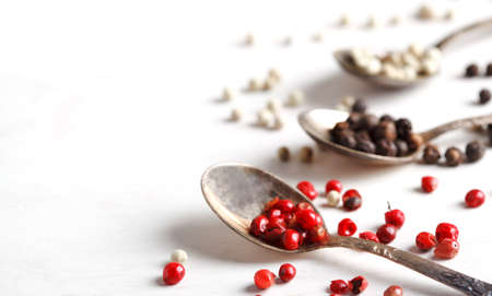 Different varieties of peppercorns, red, green, black and white peppers in a spoon