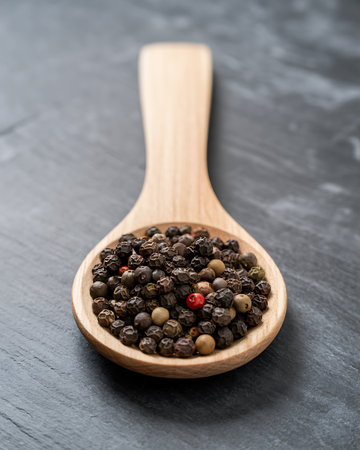 Wooden spoon with peppercorns on a dark background. Selective focus.
