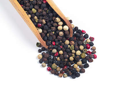 Colored peppers mix in wooden scoop close up on white background