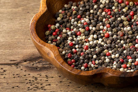 Close up shot of a mixed peppercorns on the round wooden board.