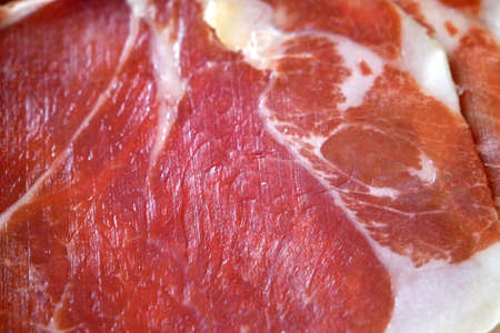 Meat, ham, jamon, or prosciutto sliced for breakfast bruschetta. Sliced ham, jamon, or prosciutto as a food background for your design