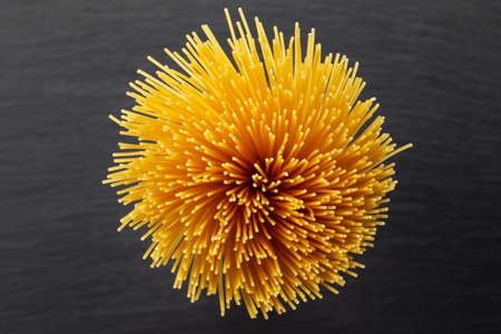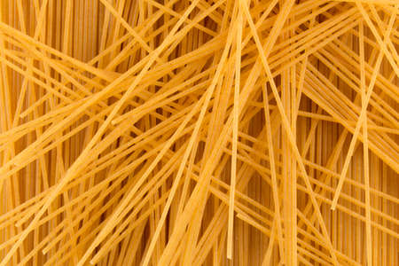 Close up of Italian pasta spaghetti in yellow colors, top view.