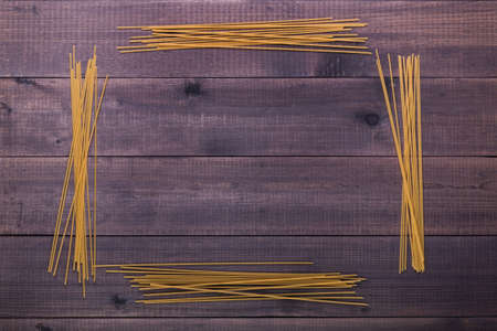Italian pasta spaghetti frame. Space for text. Wooden background