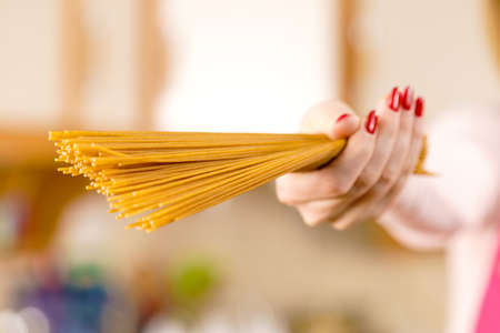 Woman holding long pasta macaroni ready to cook spaghetti. Healthy food concept.