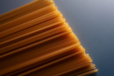 Bunch of uncooked Italian pasta spaghetti on a blue background. Abstract food macro shot, selective focus