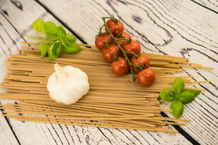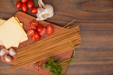 Top view of the ingredients for a healthy meal: whole wheat pasta, tomato, garlic, cheese, parsley and some herbs. Extra copy space