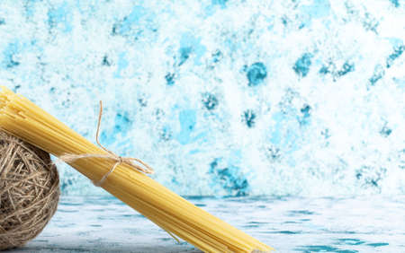 A vertical bunch of raw spaghetti tied with string. Bundle on a wooden background. View from above. Italian food concept.