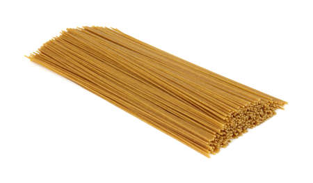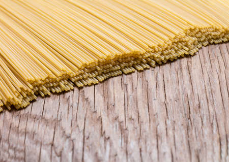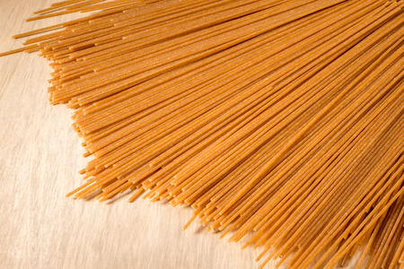 Uncooked whole grain spaghetti. Raw pasta on a kitchen table.