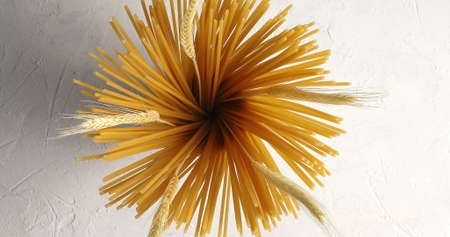 From above view of bunch of uncooked pasta decorated with twigs of wheat on white background