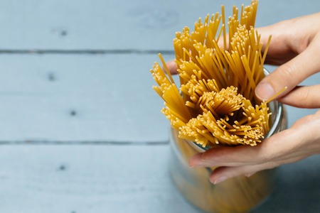 Womans hands holding spaghetti in a glass jar on a wooden vintage light background