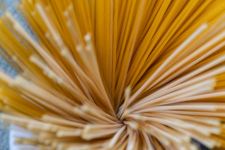 A top down closeup portrait of a bunch of uncooked hard spaghetti sticks, ready to be cooked in boiling water and added and eaten in an Italian dish.