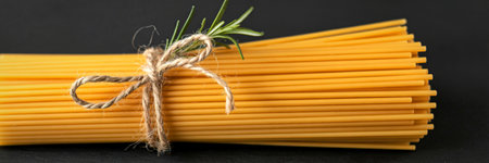Dry pasta spaghetti, bandaged with ribbon, on black background with copy space