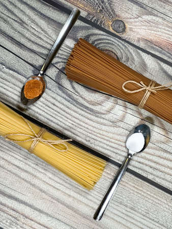 buckwheat noodle spaghetti and wholegrain spaghetti on a bright yellow and orange background. Top view. Place the text