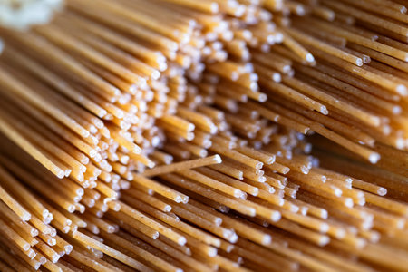 Dry spaghetti pasta strands creating a textured pattern, representing uncooked Italian food and simple ingredients