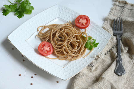 Organic spaghetti from whole grain flour. Ingredients of Italian cuisine. Copy space. Template. Mockup
