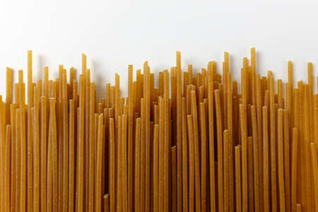 Brown raw whole grain spaghetti, italian pasta as organic food ingredient, macro product and cook book recipes