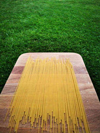 Pasta spaghetti on a wooden board in the background of green grass. Italian pasta.