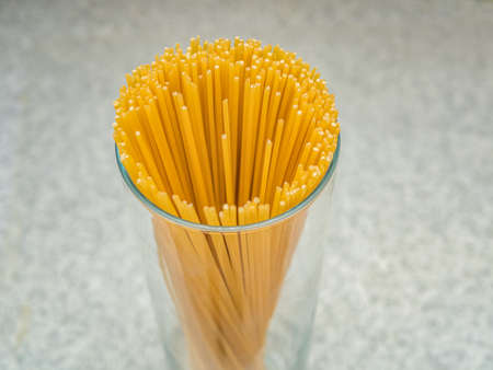 Uncooked spaghetti in glass vase on a stone background. Close-up.