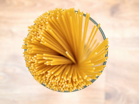 Uncooked spaghetti in glass vase on a wooden background. Close-up.