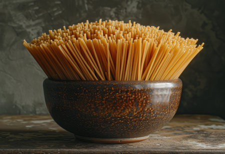 Delicious spaghetti dish in a rustic brown bowl on a wooden table against a wall