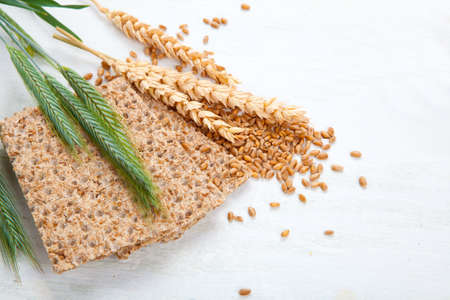 Fresh baked bread with ears of wheat. Wheat yellow. Breakfast is
