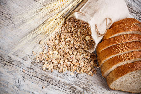Sliced wholemeal bread with cereals and various seeds, wholemeal flour, barley grains and ears of wheat on jute cloth. view from top.