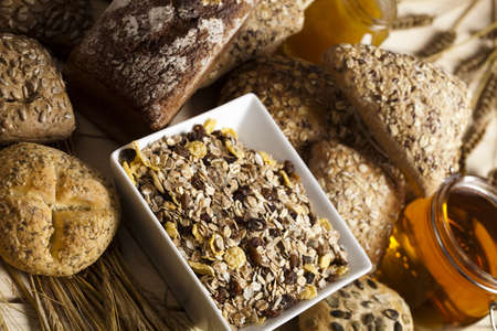 Delicious and healthy breakfast concept - cereal, Porridge and Energy bar 044