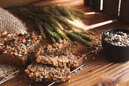 rich and natural sliced ​​and toasted bread with grains of different elements,