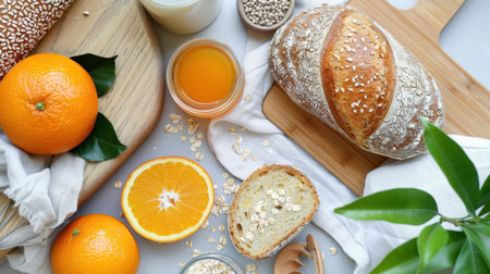 This captivating image showcases a selection of fresh breakfast ingredients, featuring bread, citrus fruits, honey, and oats arranged on a wooden surface, perfect for healthy meal preparation.