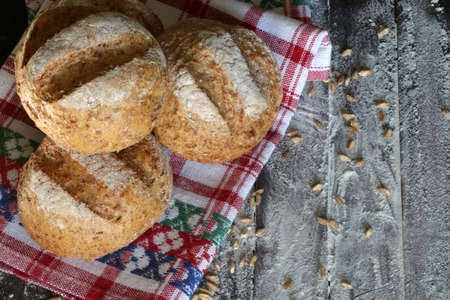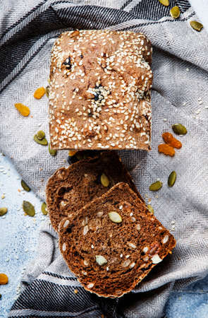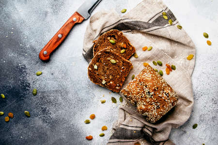 Whole wheat organic rye dark bread with pumpkin seeds, dried fruit, raisins and sesame seeds on gray towel on the kitchen table background, top view. Space for text