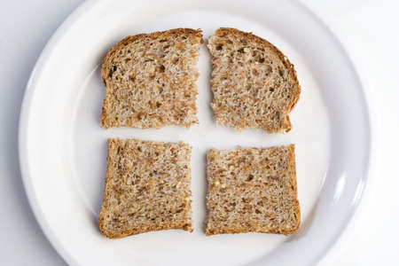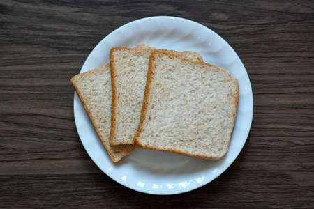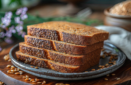 Plate holds rough-textured whole grain bread slices, offering a wholesome, rustic appeal for your enjoyment