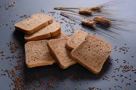 Malt Bread Slices with Oat and Flax Seeds on Dark Wooden Board. Organic Bakery Food.