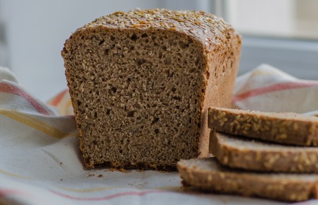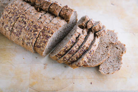 Sliced rye bread on cutting board. Whole grain rye bread with seeds.
