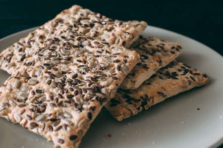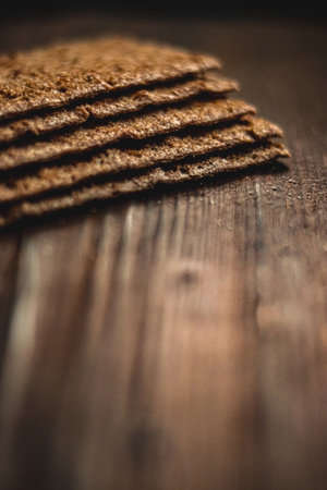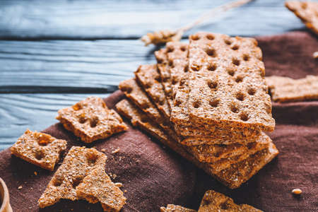 Stack of whole grain crispbread. Healthy snack food options, rich in fiber, on a rustic dark wooden background
