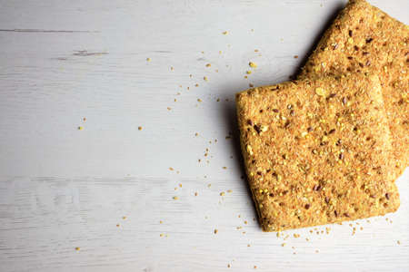 grain biscuits sprinkled with sesame seeds on a wooden background