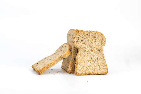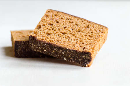 Slice of whole-grain dark bread, isolated on a white background close-up.