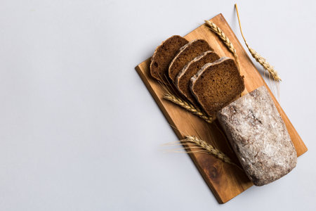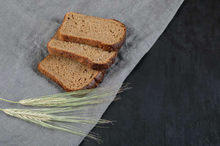 Loaf of fitness rye bread with ears of wheat, sliced on cutting board, food background. Close up. Copy space.