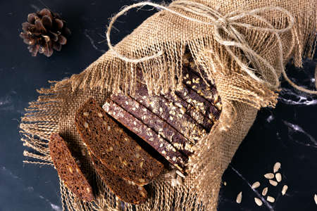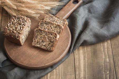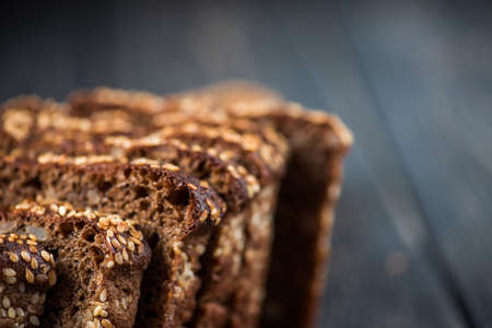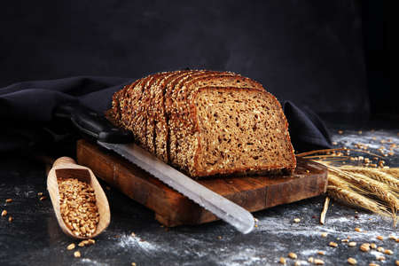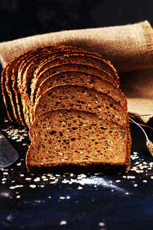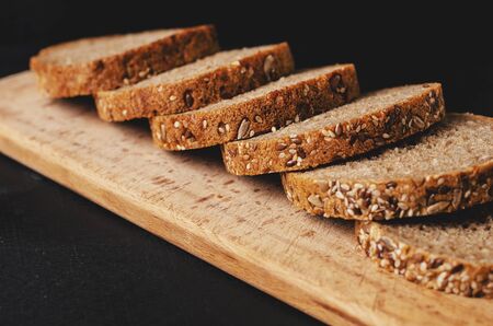Sliced rye bread on cutting board. Whole grain rye bread with seeds on rustic background