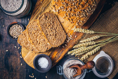 Homemade wholemeal spelt bread with sunflower seeds and baking ingredients