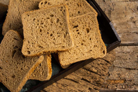 Top view sliced bread in cutting board on wooden table and gray background. horizontal