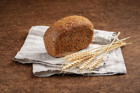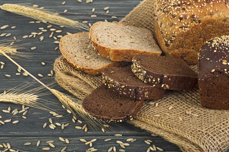 Black bread with sesame seeds and sunflower seeds, wheat ears on sacking