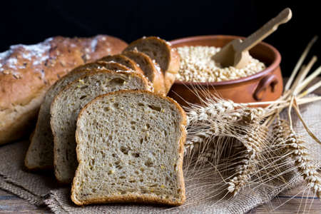 Sliced and whole ​​rye bread and ears of rye on a wooden rustic background