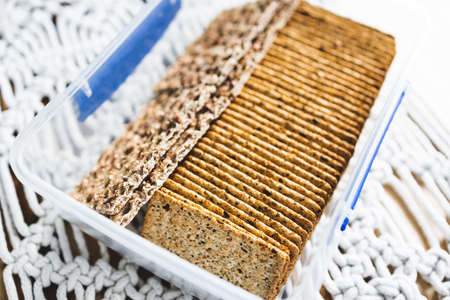 airtight container with multigrain and multiseeds crackers in tidy lines, concept of simple natural healthy ingredients and organising your pantry