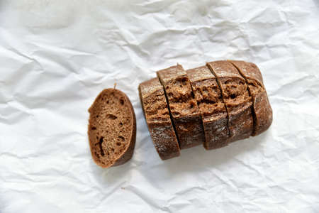 Rolls of rye black bread on white paper. french breakfast. gourmet food.
