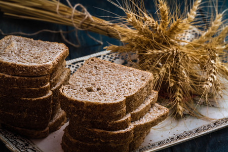 Freshly sliced whole wheat bread with ears of wheat on a tray
