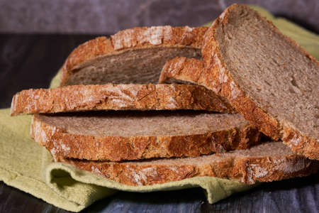 Pieces of black bread close-up on a wooden board. Wheat homemade bread