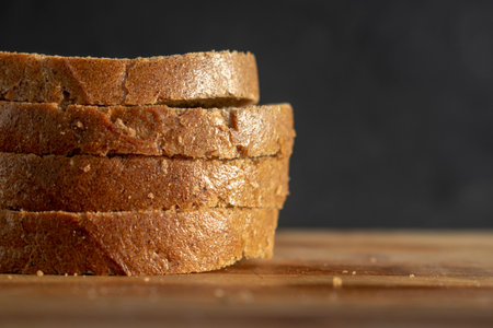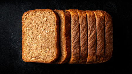 Slices of whole grain bread are neatly stacked, showing a rich texture of seeds and grains against a dark setting, emphasizing freshness and healthiness.