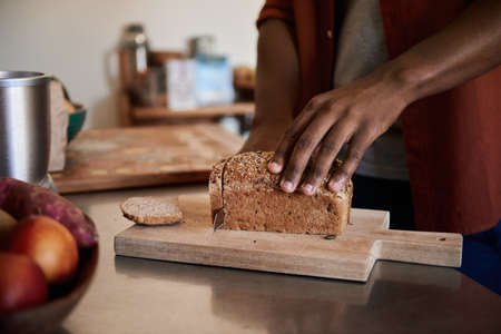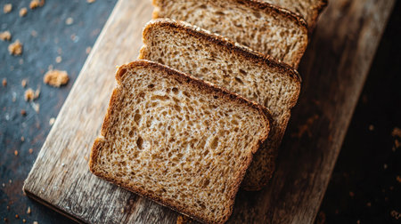 Freshly sliced whole grain bread arranged on a rustic wooden cutting board captures the essence of healthy eating. Perfect for meal preparation or casual dining.