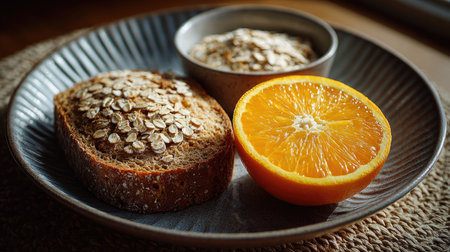 This image showcases a healthy breakfast arrangement featuring a slice of whole grain bread topped with oats, a fresh orange slice, and a bowl of oats, all set against a soothing kitchen background.