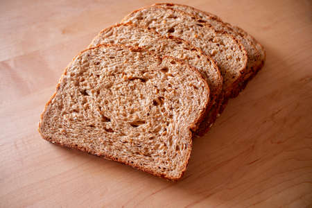 several slices of fresh baked whole wheat multi grain seeds organic bread on a wood block kitchen table